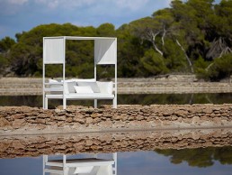 Based on a careful study of context and functional objectivity, the collection is made from welded powder-coated aluminium profiles and is available in white, bronze, sand and anthracite colour options for the subtle integration with any environment. The board structure is Solid Surface 100% recyclable, the upholstery is removable and is coated with water-repellent fabric.