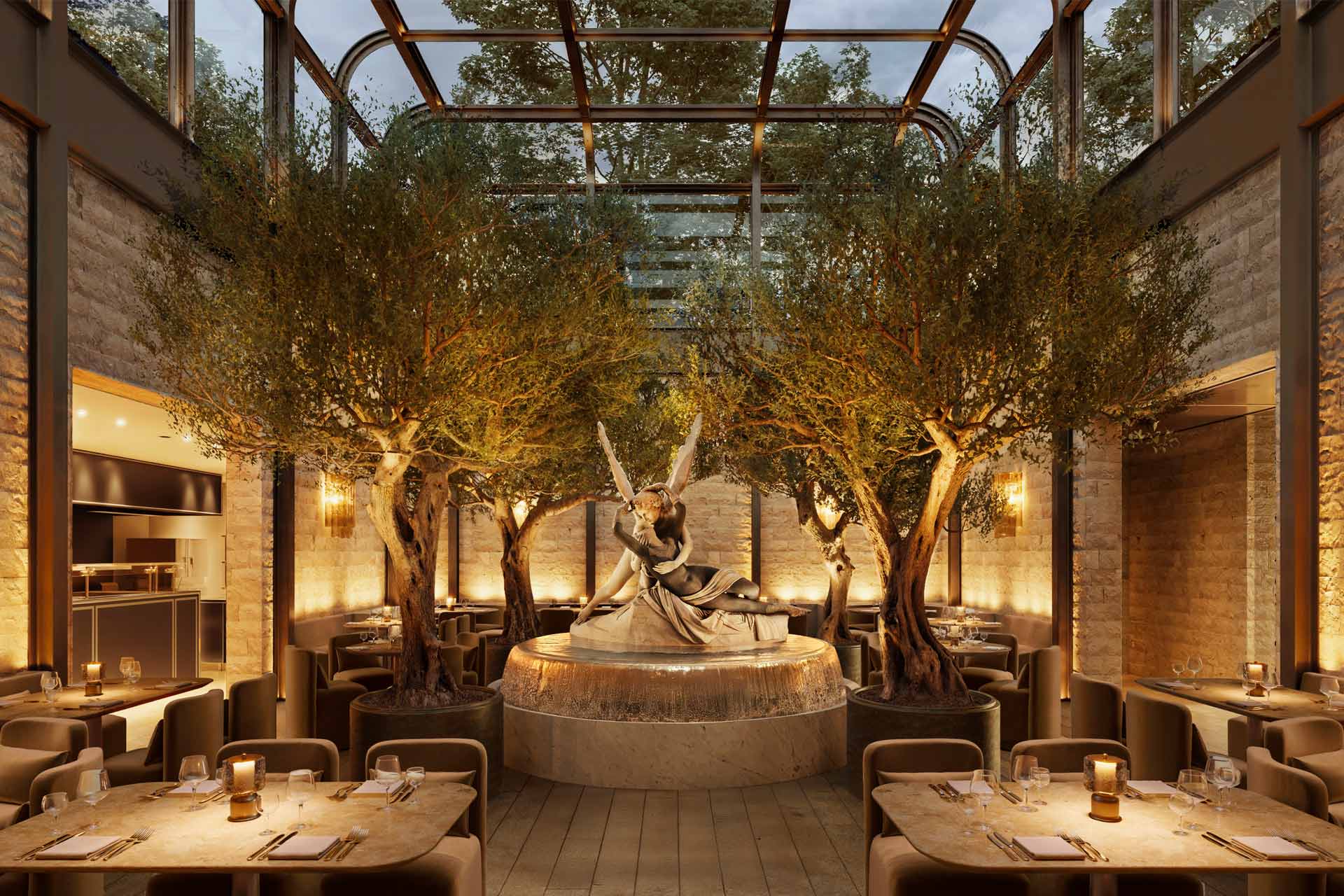 The 178-seat restaurant opens into a dramatic double-height skylit dining room, defined by a glass and steel structure, punctuated by heritage olive trees and a focal sculpture installation Amore e Psiche by Fabio Viale. La Volta features an intimate bar space, open exhibition kitchen and private dining room illuminated by a bespoke chandelier installation composed of 645 cascading golden smoke Murano glass crystals, handcrafted by Barovier & Toso.