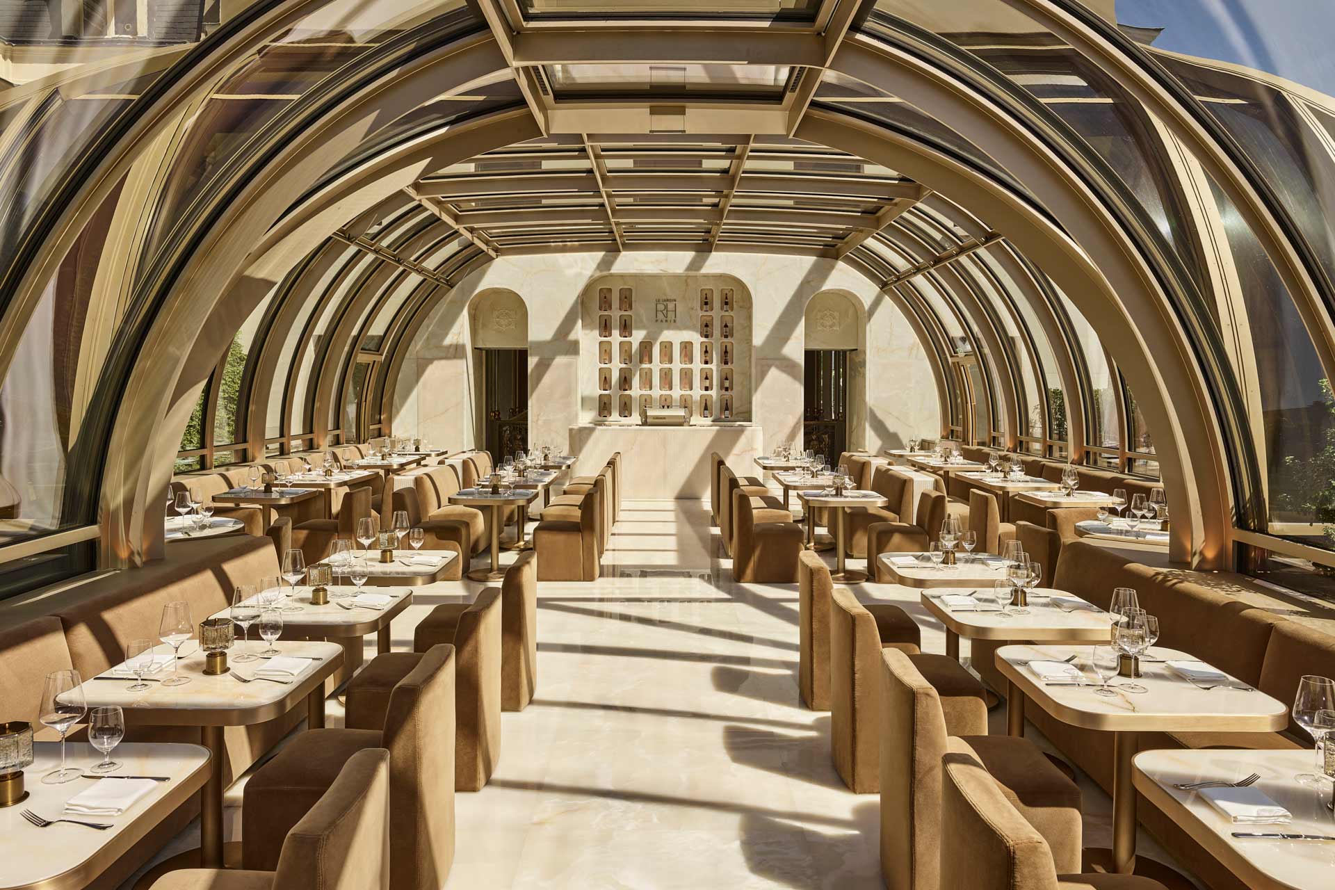At Le Jardin RH, located on the second-floor terrace, visitors can dine under a spectacular curved glass-and-steel structure inspired by the Grand Palais while enjoying a curated menu of American and Mediterranean classics.