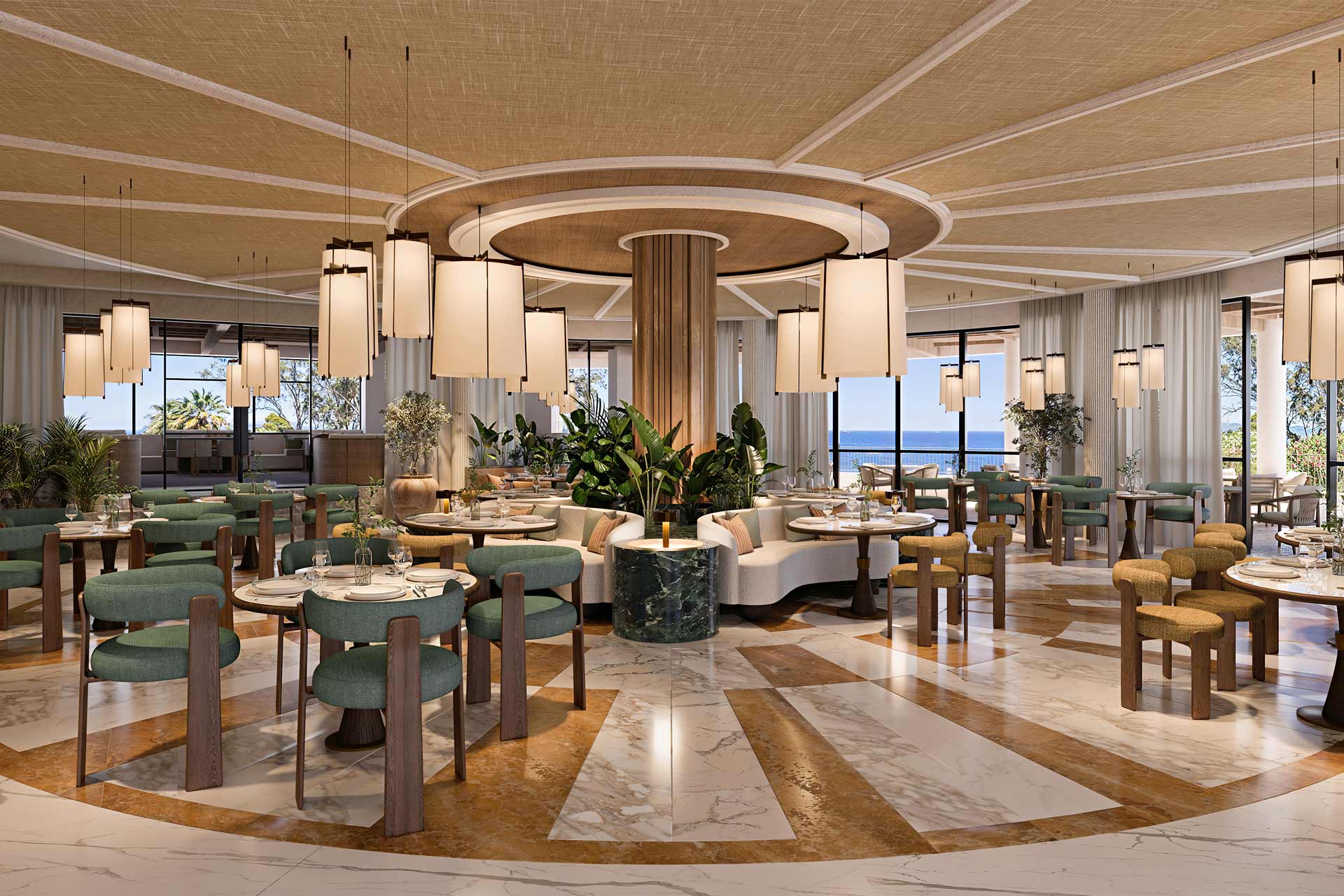 The F&B line-up extend that material language: the main restaurant carries Thebes-yellow and white marble references with warm timber and planting; the central bar pairs a stone floor with a fluted tiled counter and travertine top, while woven tapestries nod to 1960s and 1970s patterns.