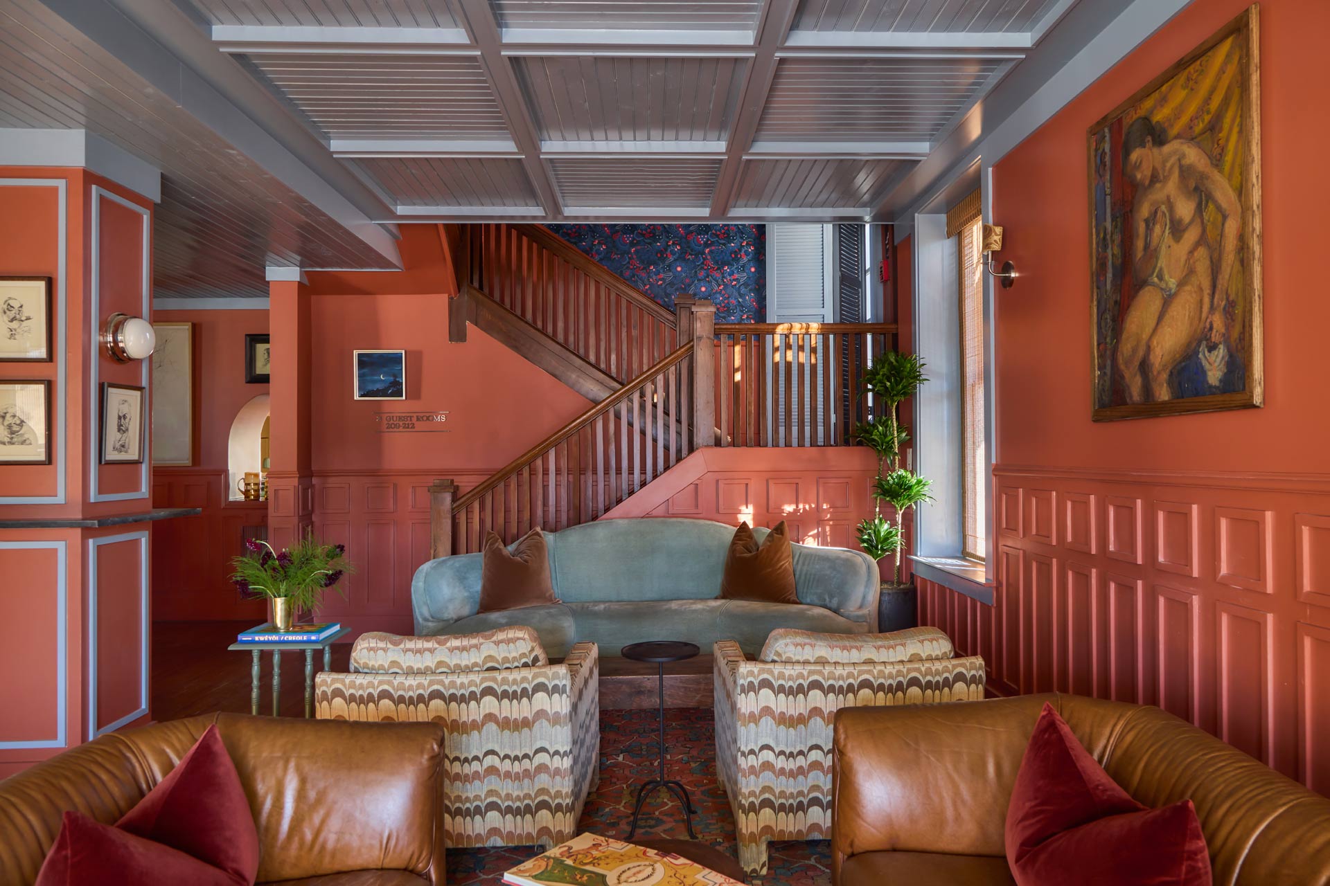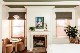 Acclaimed New Orleans–based designer Sara Costello salvaged and highlighted original elements of the property, including antique windows, fireplaces and brick flooring, pairing them with contemporary Nashville art and design. Meanwhile, Nashville designer Alyssa Spyridon helped shape the aesthetic, sourcing furnishings, decor, lighting and art from local antique dealers and showrooms, with vintage hand-knotted rugs layered throughout the public spaces. The hotel’s signature spirit animal, the coyote, appears throughout the property in guestroom ceramics, wall murals and custom carpets.