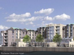 The Hotel is planned around a spine core which will rise to six storeys at its highest point, with the bedroom wings traversing and stepping down at the extremities of the building ensuring that all of Rochester’s strategic views are maintained.