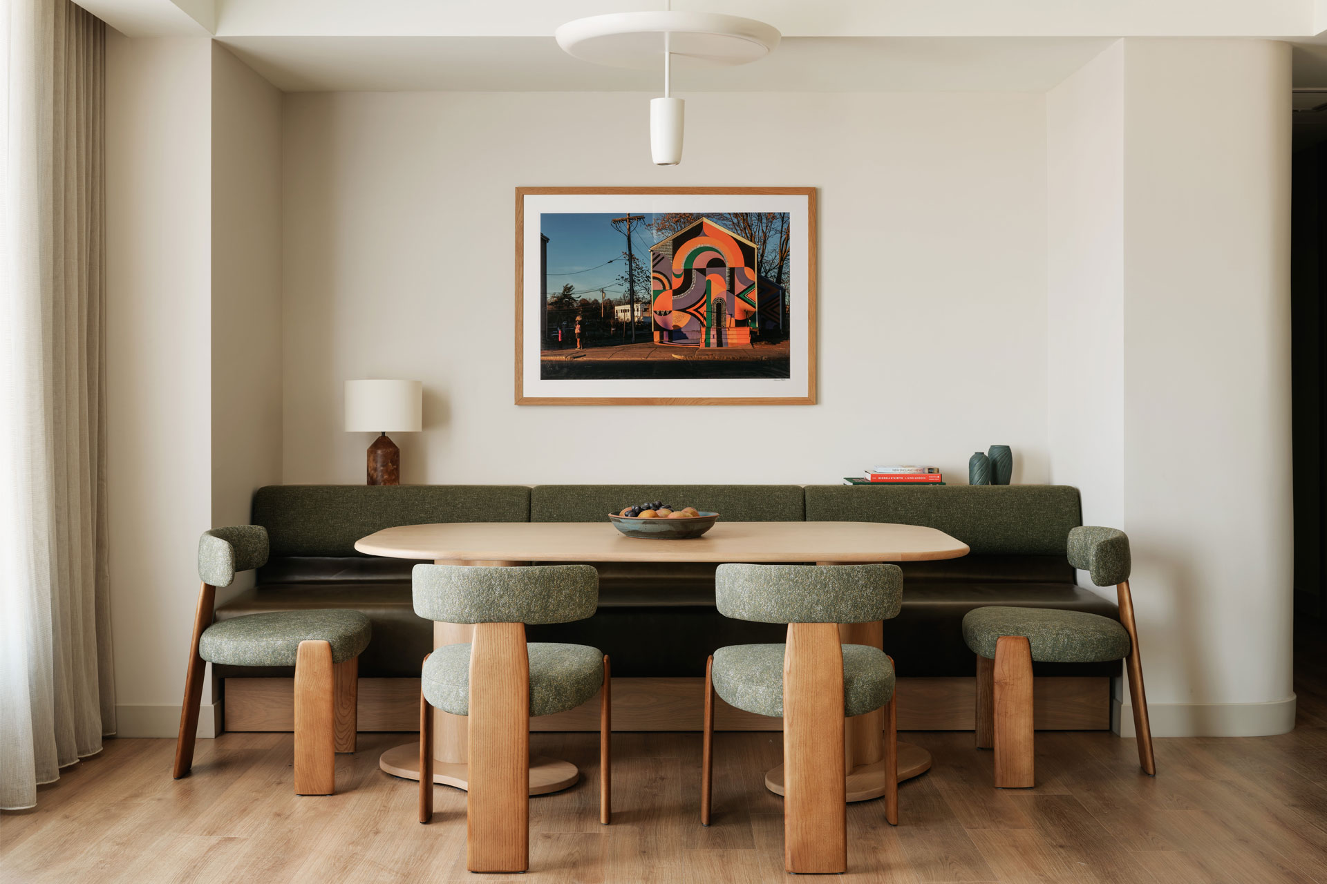 Upstairs, the guestrooms blend elevated comfort with refined, modern design. A careful balance of the hotel’s urban energy with a sense of calm rooted in proportion, craft and comfort; the room designs feature layered lighting and tailored millwork. Bullnose marble accent tables and mossy green textiles bridge connectivity to the Allston greenway just outside, while layers of calming grey and earthy tans, catching the sunrise warmth, midday clarity, and evening glow just beyond the expanse of floor-to-ceiling windows. Meanwhile, the suites offer a residential feel that remains connected to the property’s overall ethos. The design aesthetic seamlessly blends disciplined, structured forms with organic shapes, such as serpentine leather seating and green marble coffee tables, to foster creative expression and complement a warm, saturated colour palette.